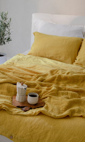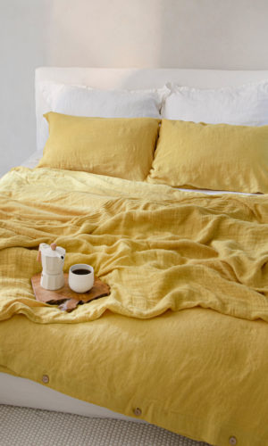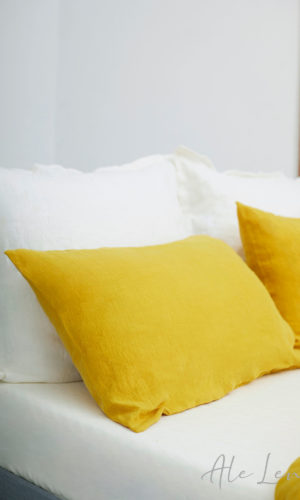 Pillow covers in two shades: jasmine white and yellow gold. White is the marriage of what is aesthetic and practical. It perfectly matches the sunny color of the other pillows, which are an energetic accent in the arrangement of the bedroom. Pillow covers made of smooth, pleasant-on-skin linen. Available in simple or decorative version: with stitching or pleats. Tie or a discreet envelope closure available.