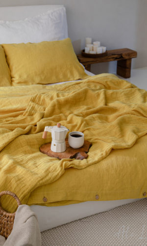 Dress your bed in a unique smooth linen made in a yellow-gold shade, which is the embodiment of life-giving energy and joy, which is the essence of youth and spontaneity. By enveloping yourself with the linen, you will feel how much nature cares about man. On hot nights you will appreciate how well it breathes and absorbs moisture while remaining light and airy. In winter, it will warm you up nicely. And, importantly, it will stay with you for a long time. Over time, it will become even softer and softer.