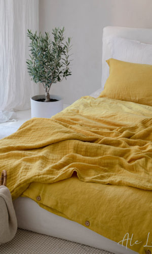 Dress your bed in a unique smooth linen made in a yellow-gold shade, which is the embodiment of life-giving energy and joy, which is the essence of youth and spontaneity. By enveloping yourself with the linen, you will feel how much nature cares about man. On hot nights you will appreciate how well it breathes and absorbs moisture while remaining light and airy. In winter, it will warm you up nicely. And, importantly, it will stay with you for a long time. Over time, it will become even softer and softer.