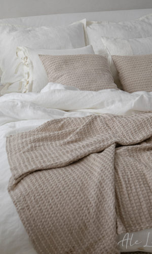 Luksus nie potrzebuje blichtru. Udowadnia to narzuta i poduszki dekoracyjne uszyte z grubszego lnu o naturalnej fakturze i barwie. Subtelnie eleganckie. Naturalnie stylowe. Znakomicie komponują się z pościelą w odcieniu złamanej bieli i beżu.