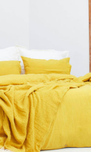 Połączenie rzadko tkanej nici lnianej z podszyciem z gęstszego lnu, dało wyjątkowy, nieco orientalny efekt. Narzuta jest jednocześnie delikatna, wręcz eteryczna, jak i na wskroś praktyczna. Łączy te przeciwieństwa z ogromnym wdziękiem, wypełniając przy tym wnętrze energią w złoto-oliwkowym kolorze.